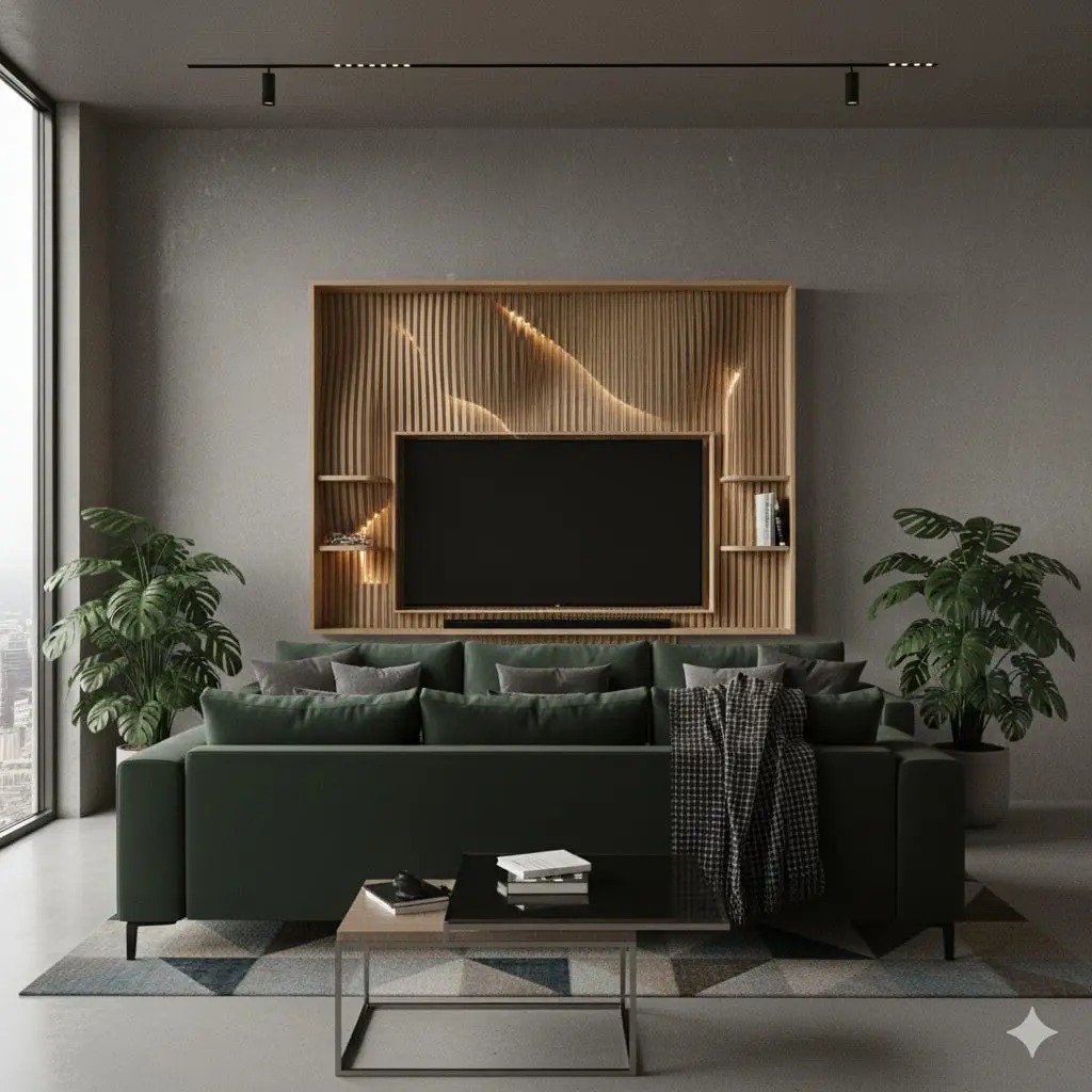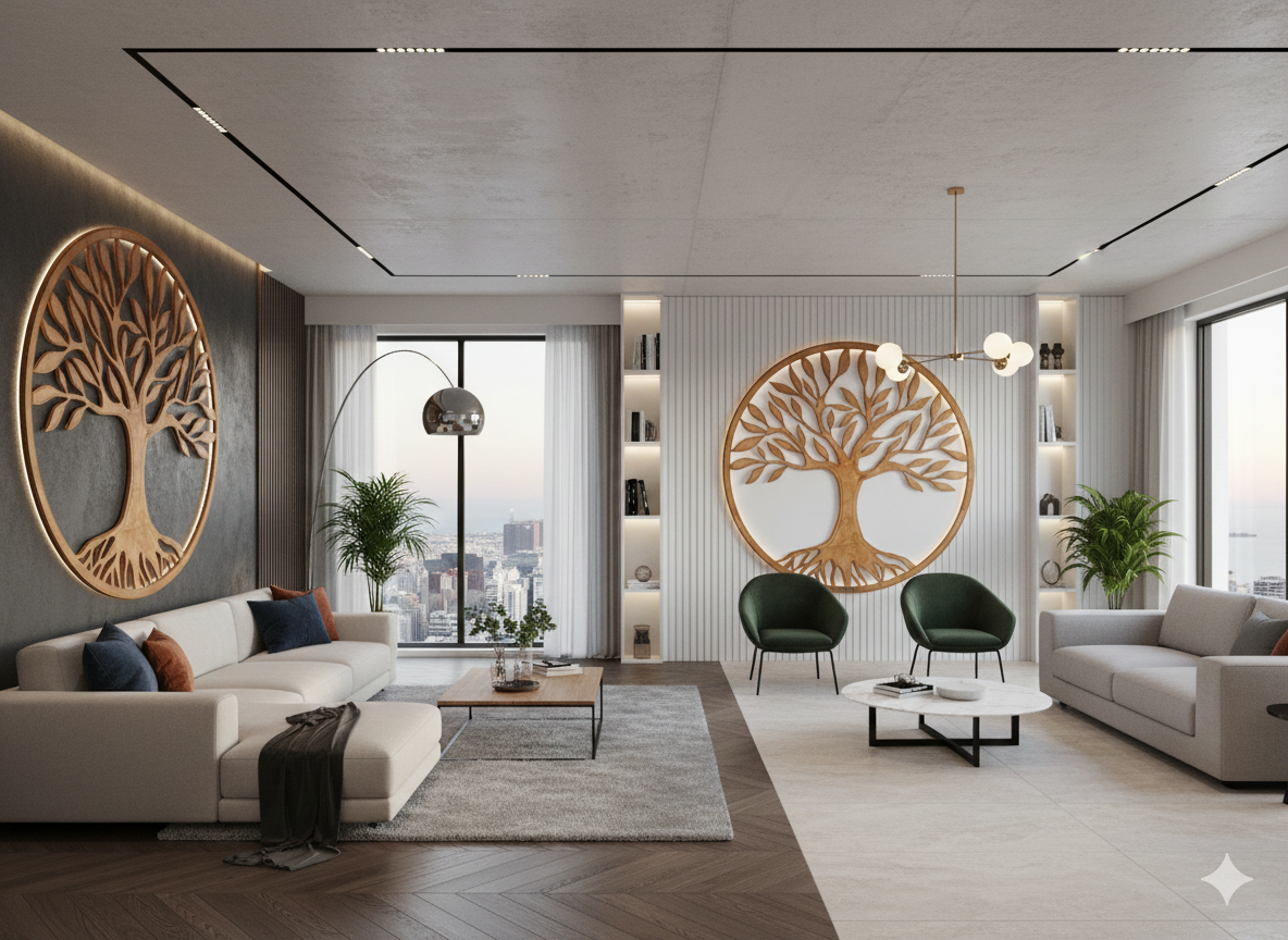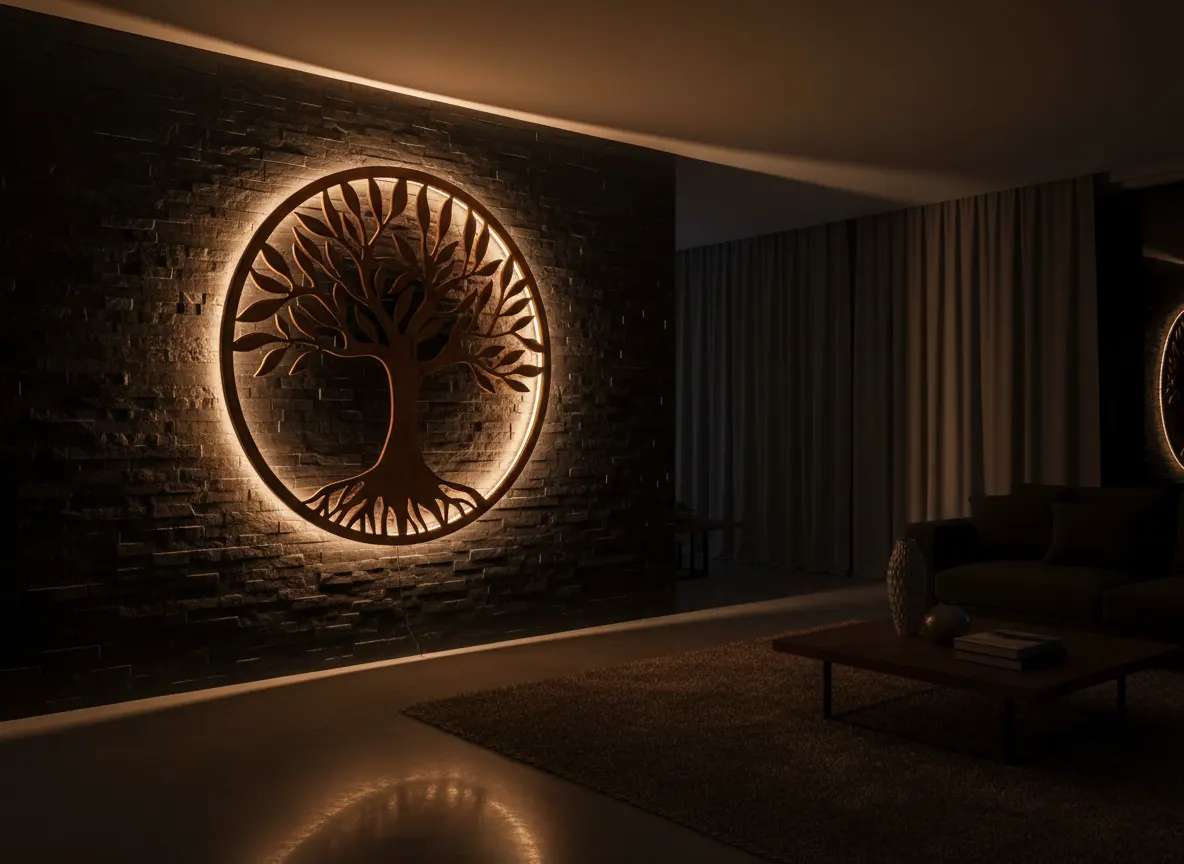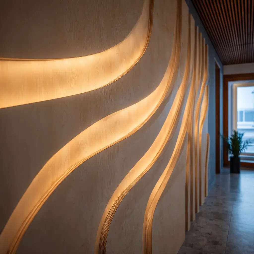 Egyedi fali dekoráció beépített LED‑világítással – organikus formák, indirekt fény és építészeti design egyben.
